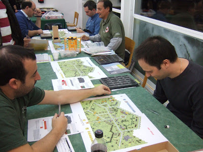 La primera ronda fue contra Jordi, persona campechana donde las haya, con él uno no se aburre y disfrute mucho jugando contra él, apuntamos en un papel para elegir bando y ambos elegimos a los japoneses, asi que tiramos dados y el se llevo el gato al agua y llevo a los japoneses, yo consegui el balance. Mi colocacion inicial me puso adyacente a los japoneses ya que no queria ceder edificos gratis, pero esa tactica se volvio en mi contra, con el mortero consiguio colocar 2 humos, cegarme, avanzar, rodearme y capturarme dos escuadras, que con las dos iniciales y esos primeros edificios me ponian las cosas muy en mi contra, Jordi jugo de manera consistente y metodica, asi que el resultado era previsible, al final en mi intento de destruir algun vehiculo japones perdi el mio, sin opciones concedi la partida.