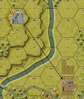 La unidad británica de infantería está estática (según hemos explicado antes) en un hexágono de sembrados (Field). La unidad alemana se encuentra en un estatus de cresta de nivel 2.